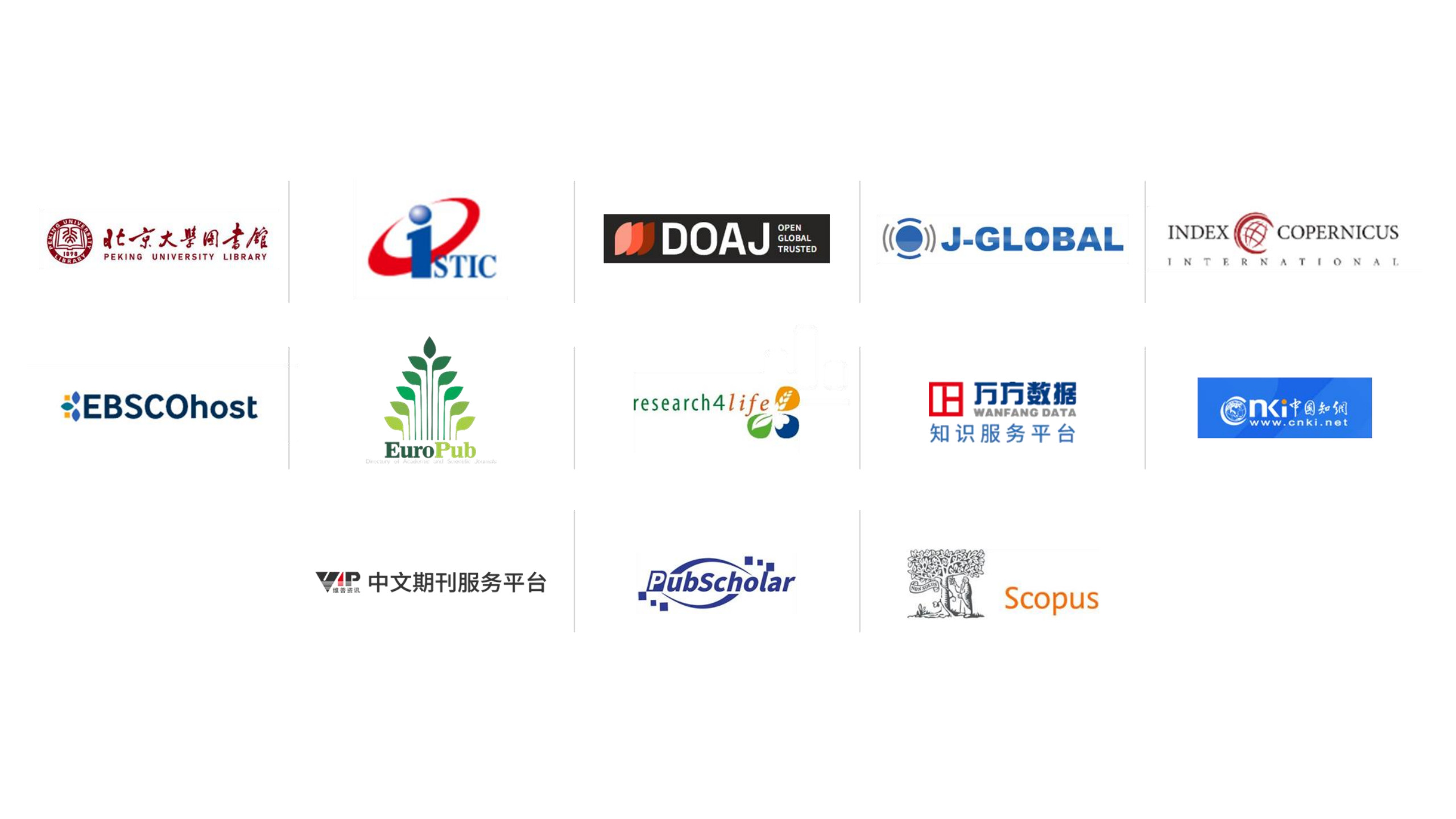 The journal is indexed by Directory of Open Access Journals (DOAJ), Japan Science and Technology Agency (JST),ICI World of Journals/ICI Master List (ICI),EBSCOhost, EuroPub, Research4Life (HINARI),Scopus, Chinese Science Citation Index (CSCI), Chinese Scientific and Technical Papers and Citation Database (CSTPCD), WANFANG Database, China National Knowledge Infrastructure (CNKI), CQVIP, Chaoxing, Chinese Science and Technology Journal (CSTJ) and Pubscholar. These databases serve as an international stage for authors' research works.