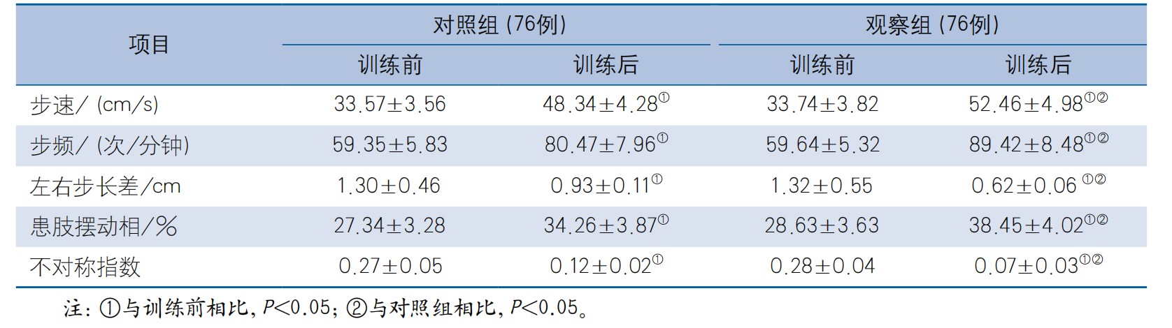 P<0.001], stride frequency [(89.42±8.48) times/min vs. (80.47±7.96) times/min, P<0.001] and limb swing phase (38.45%±4.02% vs. 34.26%±3.87%, P<0.001) in the observation group were all higher than that in the control group; the left and right step length difference [(0.62±0.06) cm vs. (0.93±0.11) cm, P<0.001] and asymmetry index [(0.07±0.03) vs. (0.12±0.02), P<0.001]